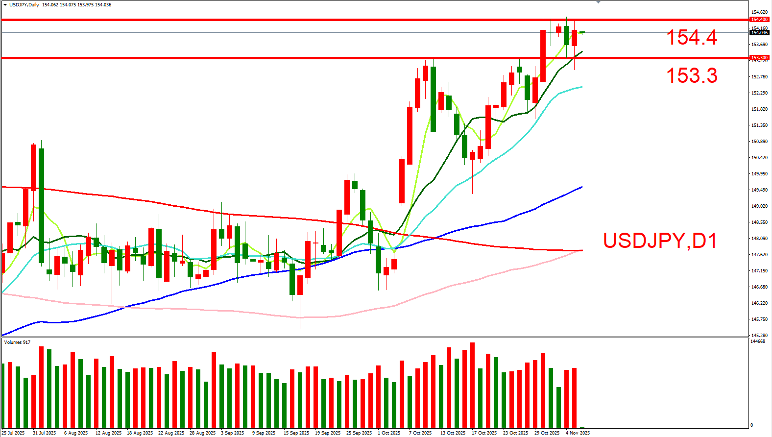 鲍威尔和美联储官员鸽派言论与美联储降息预期再次回归,加上高市早苗当选后的宽松政策利好预期,因此美日兑偏向多头看待。短线上可以(154.4,10/30高位)与(153.3,10/10前高)作为压力与支撑位来做参考。