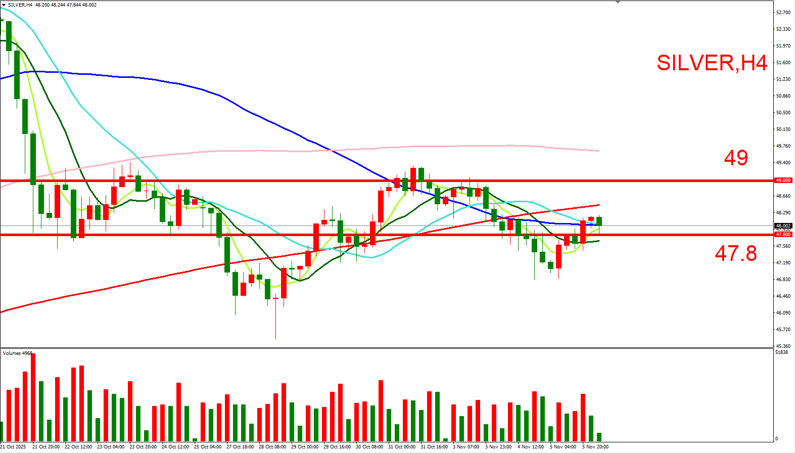 白银跟随黄金同步偏向多头看待。可参考(49,近两周多次反弹高位)与(47.8,10/21大量低位),来作为压力与支撑位参考,用以判断低接或突破进场机会。