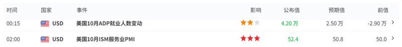 随后公布的美国服务业PMI为52.4,同样高于预期与前值,其中新订单指数显著上升,反映服务业活动持续扩张,不过就业分项仍处于收缩区间,显示企业在招工方面依旧谨慎。