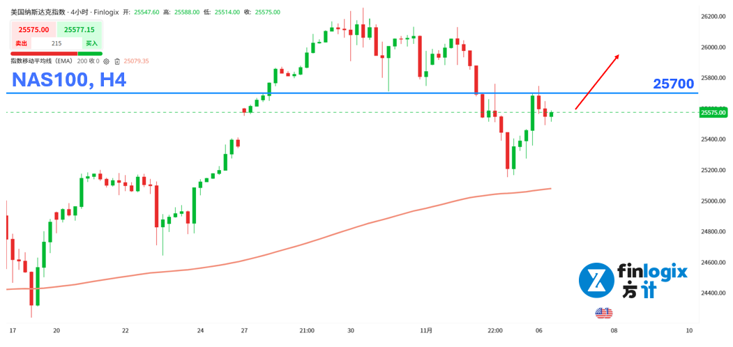 技术面:纳指收復因AI估值恐慌带来的修正,尤其昨天下跌再度止步于4小时的200均线。若今天风险情绪能持续改善,将有助那指进一步向上突破25700前高阻力,并出现日内突破做多的机会。