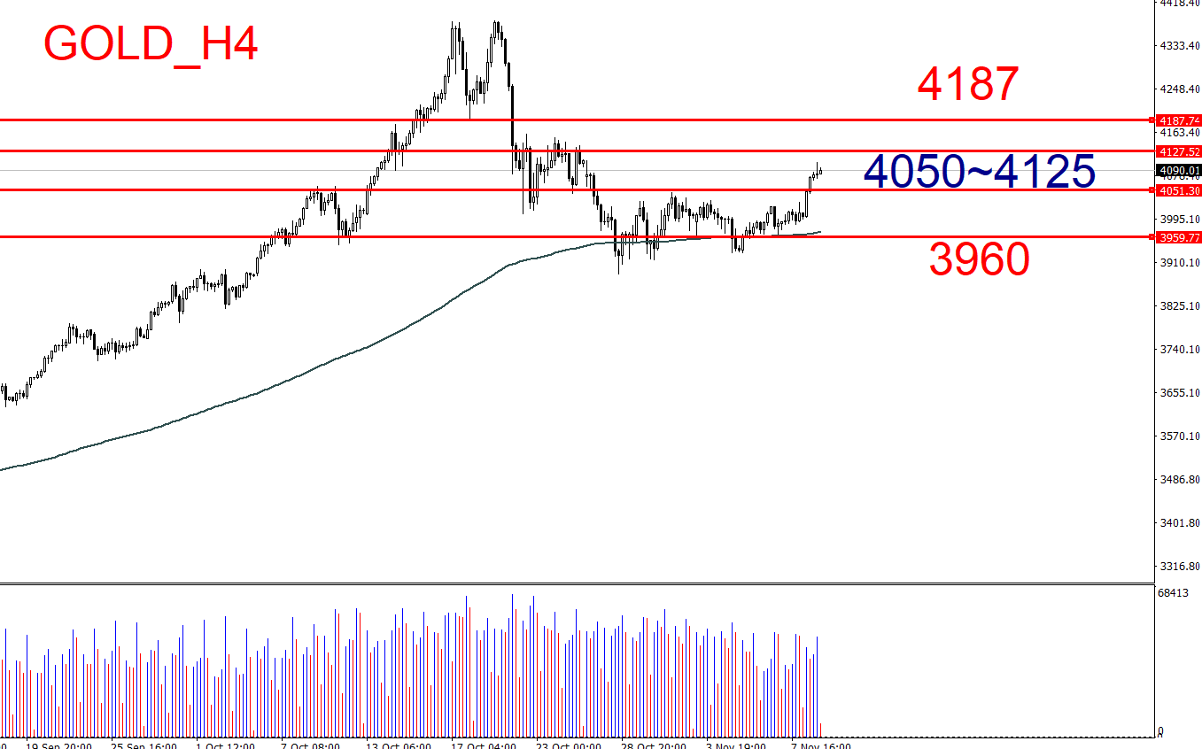 价格触及4050并反弹: 可尝试多单,目标看向区间上沿(4125)。