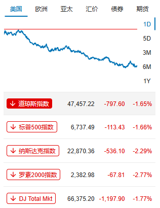 美股三大股指全线下挫,道指收跌1.6%,标普500指数跌1.66%,纳斯达克综合指数跌2.29%。