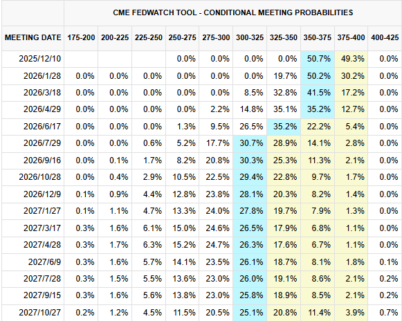 据联邦基金期货合约显示,投资者已将12月降息概率下调至约47%。而在10月美联储会议前,市场预期的降息概率曾高达100%。交易员预计到2026年底,联邦基金利率将从目前的3.75%-4%区间降至3%-3.25%区间。随着****停摆结束,机构恢复发布官方统计数据,美联储官员将重新获得美国经济状况的最新信息。但尚不清楚在12月会议前能及时获得多少新数据。