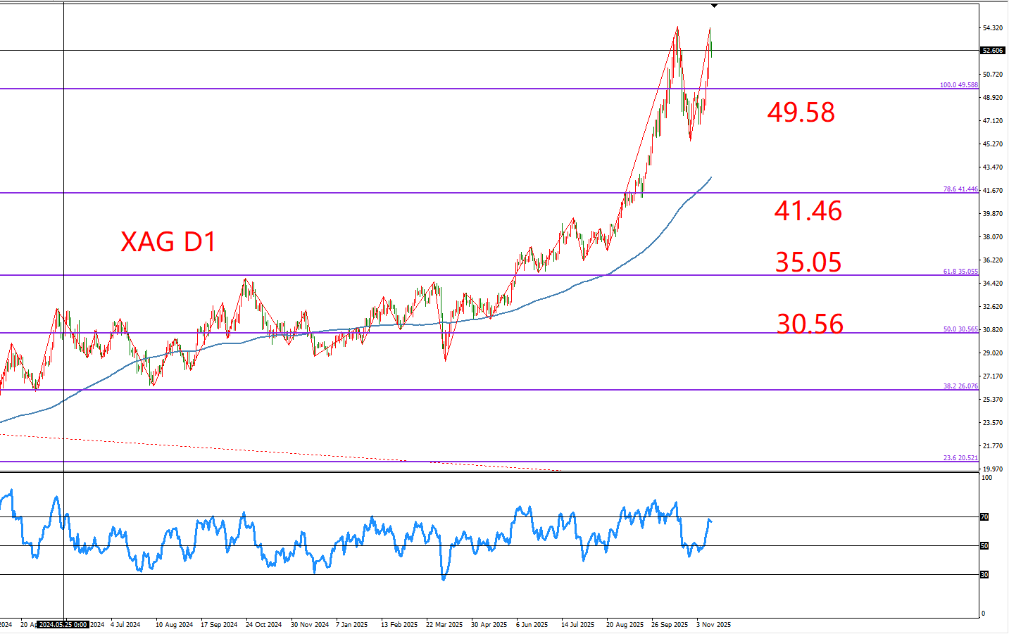 下方支撑:49.58 / 41.46 / 35.05 美元/盎司