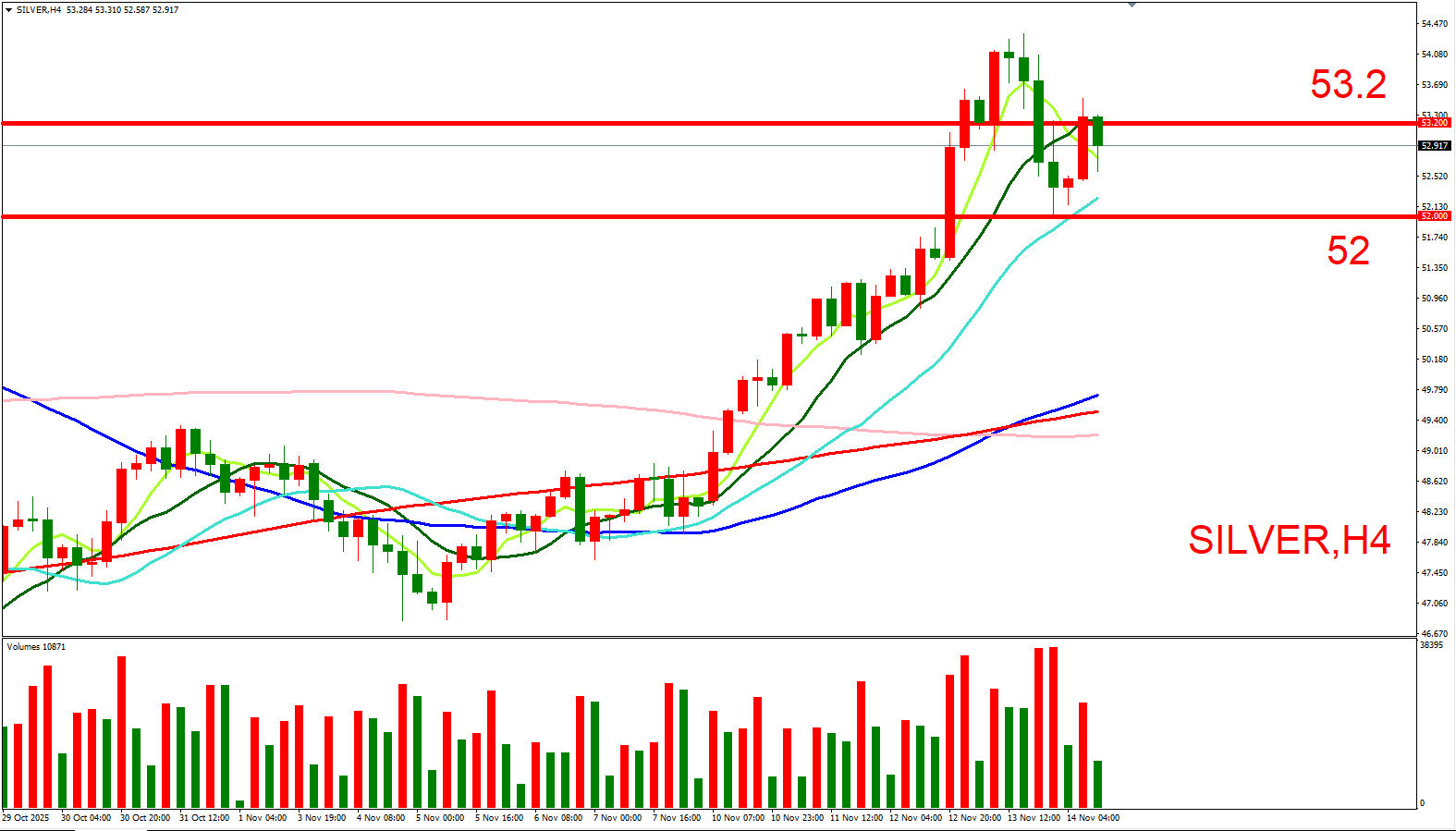 白银跟随黄金同步偏向多头看待。可参考(53.2,11/14大量高位)与(52,11/14大量低位),来作为压力与支撑位参考,用以判断低接或突破进场机会。