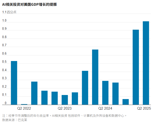 上周波及人工智能(AI)相关股票的动荡凸显了美国经济面临的一项广泛风险。经济增长已愈发依赖与AI相关的投资和财富效应,若这轮热潮反转为衰退,整体经济可能会因此受累。今年上半年,企业在AI领域的投资对经通胀调整后的国内生产总值(GDP)增长的贡献可能高达一半。AI类股票的上涨也推高了家庭财富,从而带动了消费,最近几个月表现尤其明显。若剔除AI支出,经济状况会更显糟糕。尽管9月份就业增长高于预期,但今年以来就业增长总体放缓,失业率也在上升。据德意志银行的数据,自2019年以来,剔除AI相关领域的私营企业投资基本持平。除数据中心外,购物中心或写字楼等其他商业建筑的建设活动均有所减少。