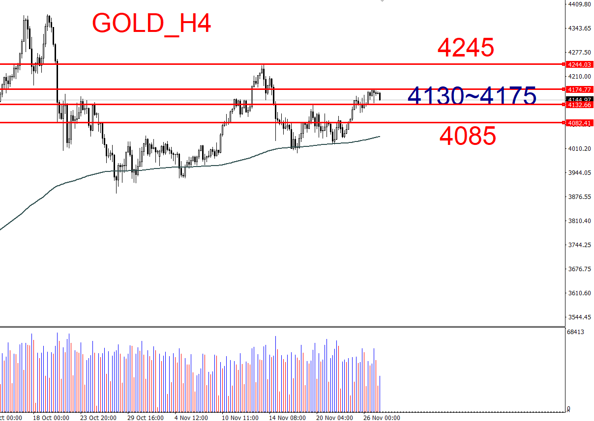 价格触及 4130并反弹: 可尝试多单,目标看向区间上沿(4175)。