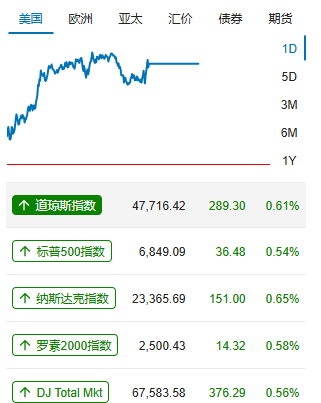 美股标普500指数收涨0.54%,道指数收涨0.61%,纳指收涨0.65%。其中,标普500指数、道指均录得月线7连涨,纳指则为7个月以来首次下跌。