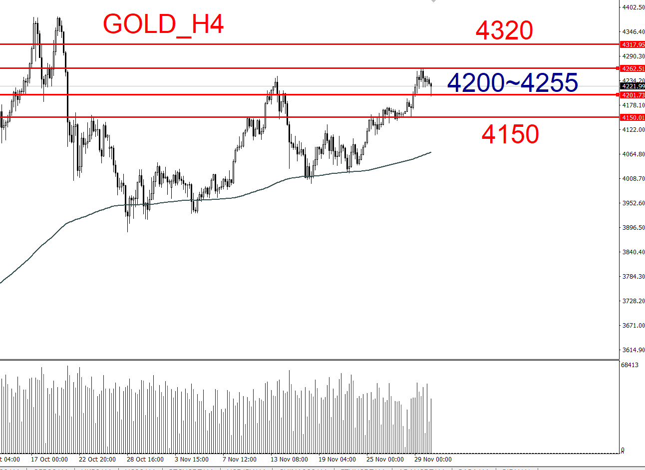 价格触及 4200并反弹: 可尝试多单,目标看向区间上沿(4255)。