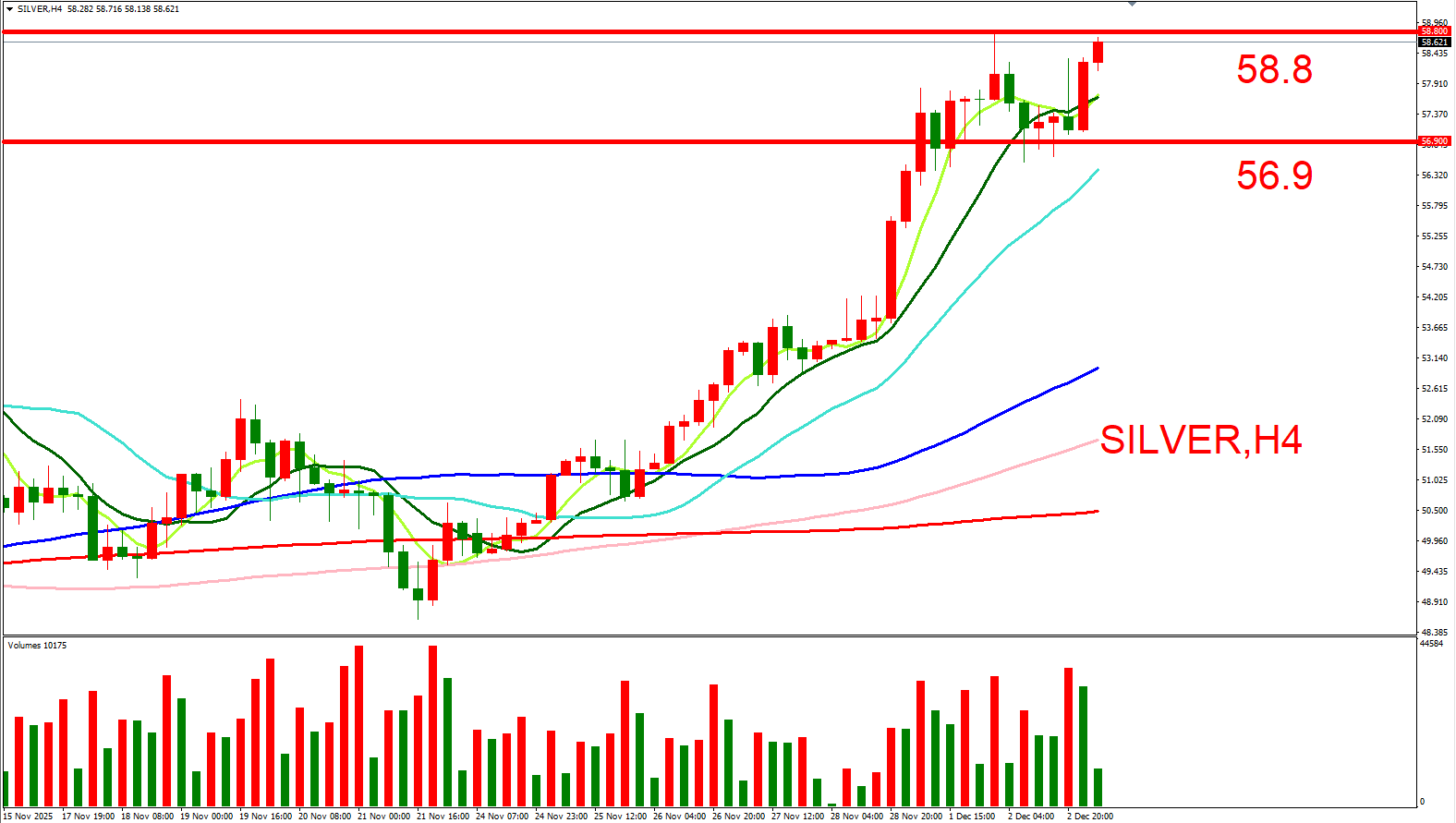 白银跟随黄金同步偏多看待。可参考(58.8,历史最高位)与(56.9,近数日横盘低位),来作为压力与支撑位参考,用以判断低接或突破进场机会。