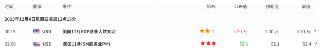 美元跌破 99 大关,创下 9 月以来的单日最大跌幅!主因是 ADP 就业数据明显疲软,11 月私部门就业(小非农)远低于预期甚至转负,带动市场对 12 月降息的押注从 87% 再升至 90%。