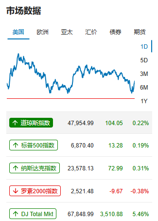 美股收高,道指涨0.61%,报47716.42点;纳指涨0.65%,报23365.69点;标普500指数涨0.54%,报6849.09点。