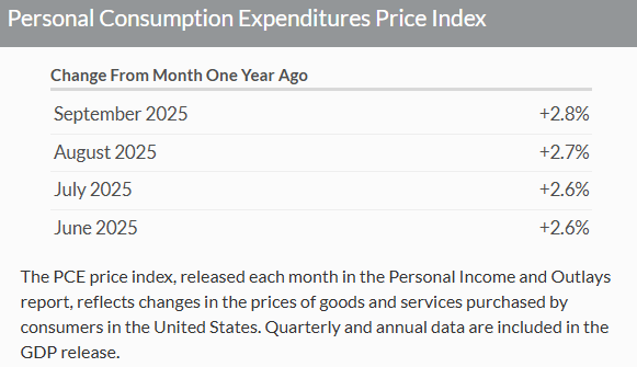 宏观数据方面,根据美国商务部数据,剔除食品和能源项目的所谓核心个人消费支出(PCE)价格指数环比上涨0.2%,与8月数据持平,符合市场预期;同比增速则意外回落至2.8%,创三个月低位,市场预期为连续第三个月录得2.9%。美联储官员将PCE物价指数作为衡量通胀的主要政策工具。虽然官员们会同时参考整体和核心数据,但他们普遍认为核心数据是衡量长期通胀趋势的更优指标。该报告因****停摆而推迟了数周,停摆期间所有数据收集和经济报告均告暂停。对于下一份PCE数据,经济分析局表示,下一次数据的发布时间尚未重新安排。
