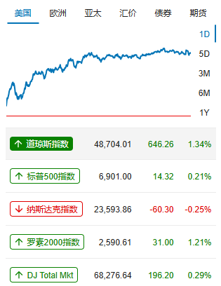 美股道指收涨1.34%,创下历史新高。标普500指数涨0.2%,纳斯达克综合指数跌0.25%。