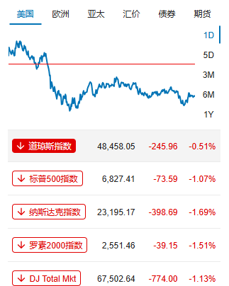 美股低开低走,道指收跌0.51%,标普500指数跌1.07%,纳斯达克综合指数跌1.69%。
