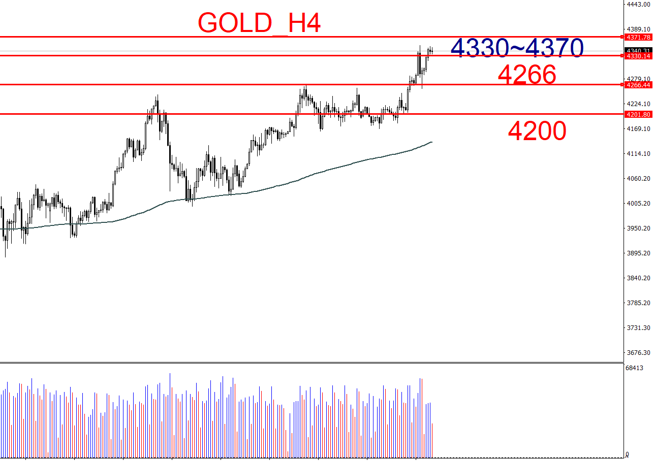 突破4370:可尝试多单,目标看向更高点位(如4380或更高)。