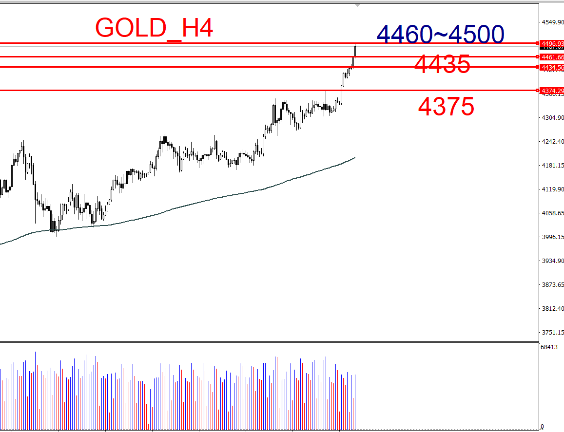 突破4500:可尝试多单,目标看向更高点位(如4550或更高)。
