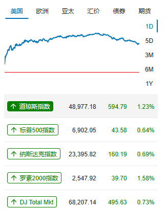 美股三大股指齐涨,道指初步收涨1.23%,创下新高。标普500指数涨0.64%,纳指涨0.69%。