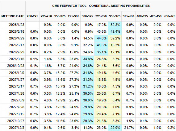 美联储官员已暗示,在2025年底连续三次降息后,本月(1月)可能会维持利率不变。卡什卡利也谈到了美联储主席鲍威尔的任期问题,表示虽然不清楚具体计划,但他乐见鲍威尔在任期结束后继续留任美联储理事。根据芝商所FEDWATCH工具来看,当前市场预估本月利率决议美联储维持利率区间不动的概率为82.8%,降息25个基点的可能性为17.2%。