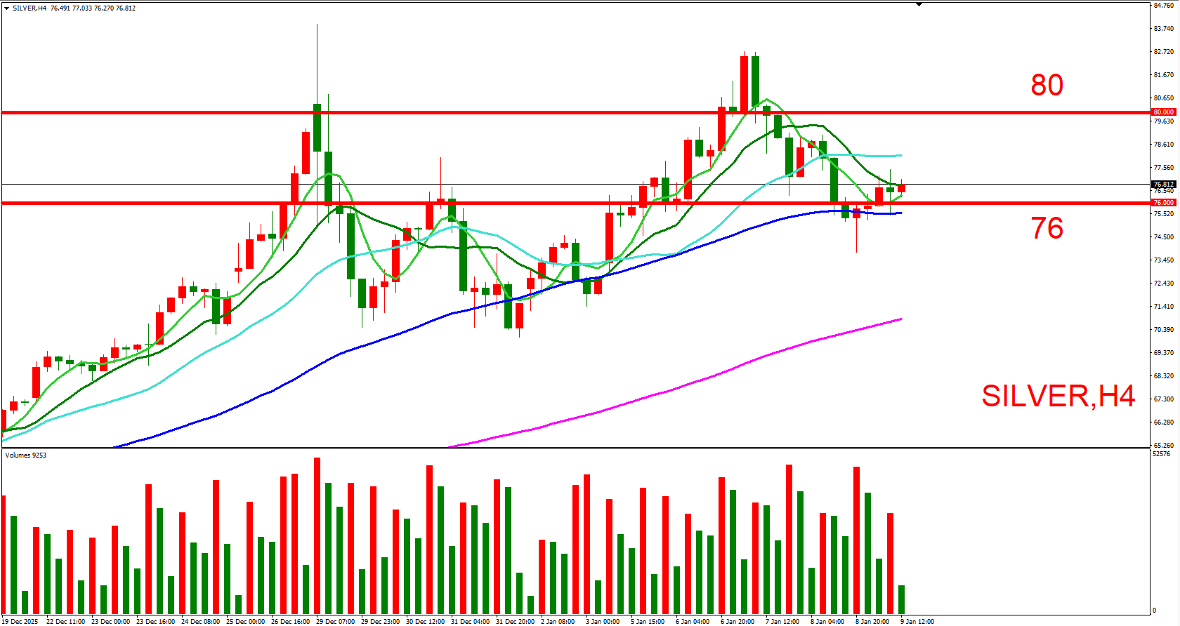 白银跟随黄金同步,短线偏多看待。可参考(80,整数大关)与(75.9,01/06长红上涨起点),来作为压力与支撑位参考,用以判断低接或突破进场机会。
