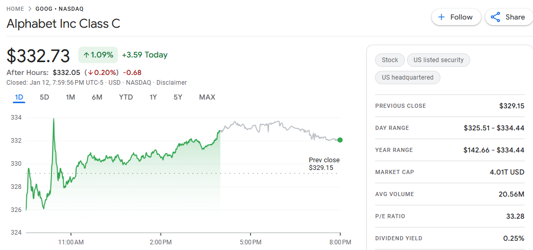 双方虽未公开交易条款,但市场预估苹果每年将向 Google 支付约 10 亿美元。受此次消息推动,Alphabet 股价当日走高,市值突破 4 万亿美元,成为继苹果、微软与英伟达之后第四家达到该里程碑的科技公司。