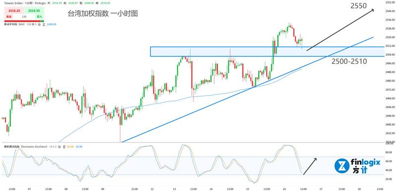 技术面:100均线向上,趋势线提供支撑,价格处在强势上涨期。配合台积电良好财报,股指短线有望持续破新高。交易策略以回踩看涨为主,入场时机配合随机指标超卖区金叉。目标先看前高点。突破后可以配合随机指标高位死叉进行波段止盈。