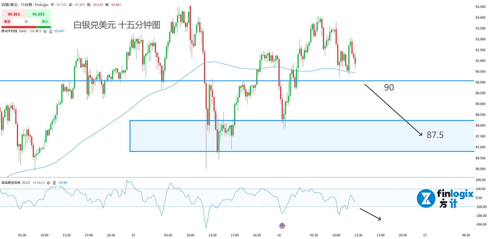 技术面:100均线水平,方向未定。白银价格处在水平大幅震荡行情中,支阻互转水平线90大关是关键位置,一旦跌破则有继续大幅下滑的动力。交易策略以突破跟随为主,为了提高入场胜率,可以配合CCI跌破-100线的空头信号。如果在午后盘或夜盘能站稳90,则有短暂看涨机会。