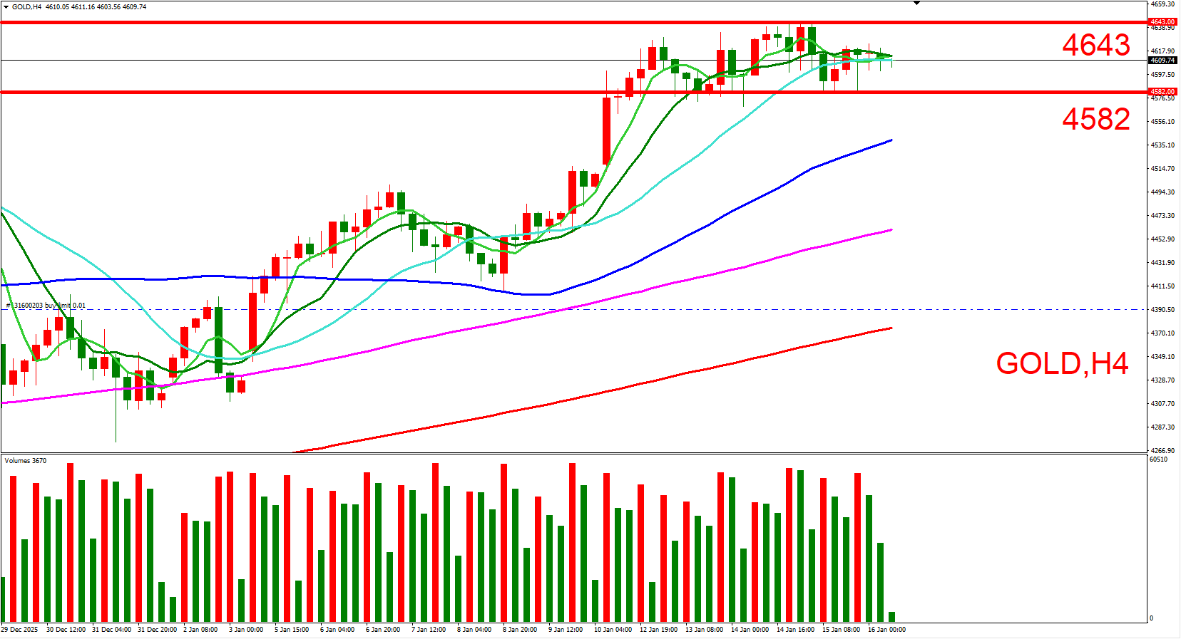 短线可以(4643,历史最高位)与(4582,本周横盘高位) 来作为压力与支撑位参考,用以判断低接或突破进场机会。