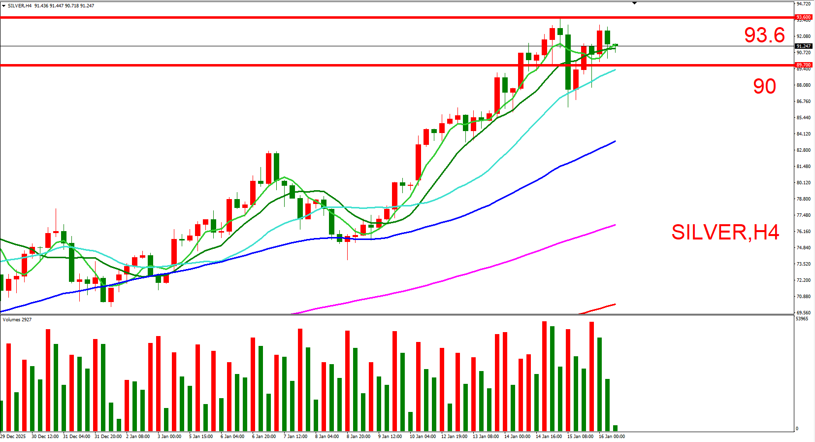 白银跟随黄金同步,短线偏多看待。可参考(93.6,历史最高位)与(90,整数大关),来作为压力与支撑位参考,用以判断低接或突破进场机会。