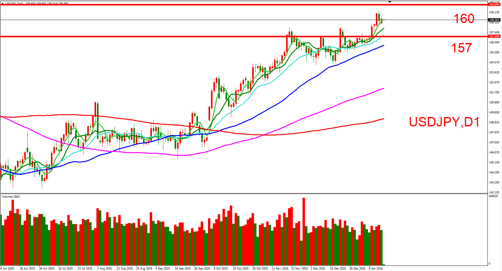 日本央行12月虽如预期降息,然而在记者会却意外大放鸽派论调,使得2026年大举升值希望再次落空,并且日本政局近期较为动荡,因此短线上美日兑将偏向多头看待。短线上可以(160,整数大关与日本央行心理防线)与(157,整数大关+短期均线支撑区)作为压力与支撑位来做参考。