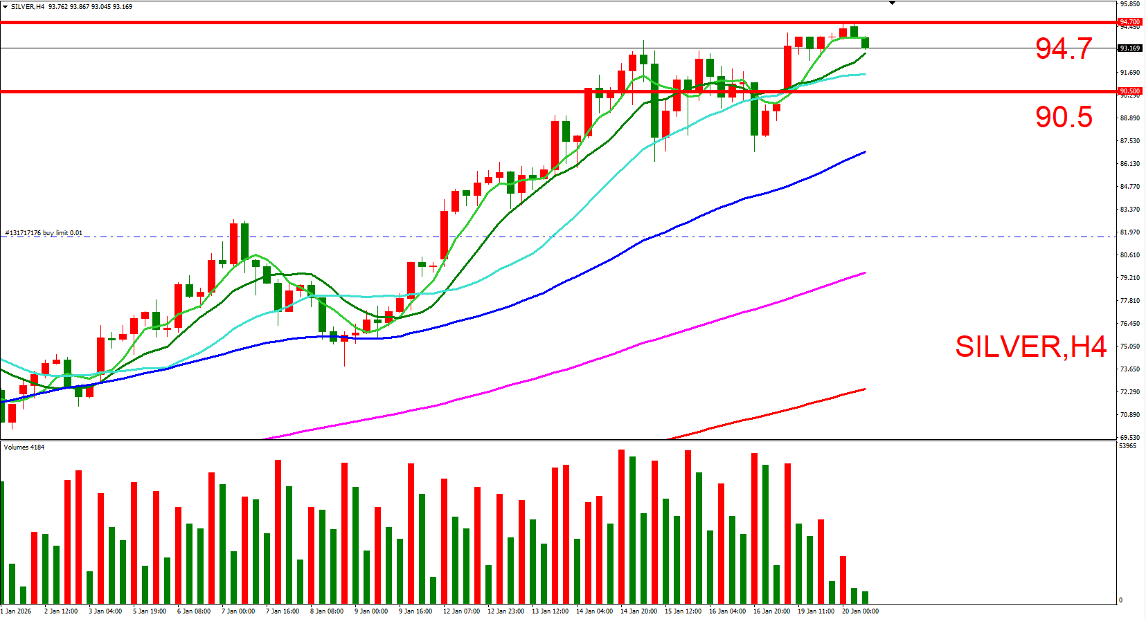 白银跟随黄金同步,短线偏多看待。可参考(94.7,历史最高位)与(90.5,周一跳空上涨起点),来作为压力与支撑位参考,用以判断低接或突破进场机会。