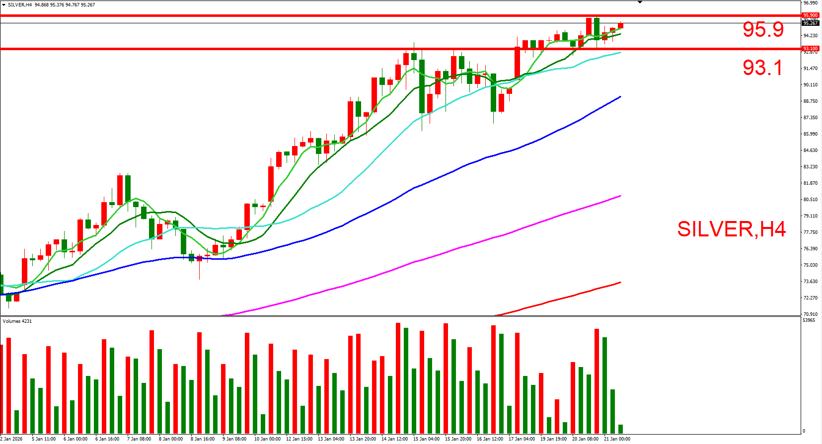 白银跟随黄金同步,短线偏多看待。可参考(95.9,历史最高位)与(93.1,昨日大量低位),来作为压力与支撑位参考,用以判断低接或突破进场机会。