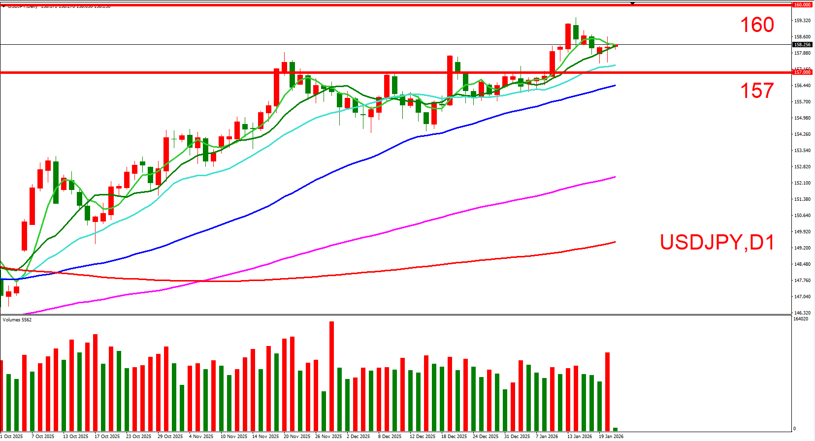 日本央行12月虽如预期降息,然而在记者会却意外大放鸽派论调,使得2026年大举升值希望再次落空,并且日本政局近期较为动荡,因此短线上美日兑将偏向多头看待。短线上可以(160,整数大关与日本央行心理防线)与(157,整数大关+短期均线支撑区)作为压力与支撑位来做参考。