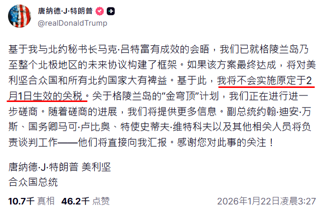 川普周三于达沃斯世界经济论坛发表演说,宣布已与北约领导人就格陵兰达成「未来协议框架」,并正式撤回原定自 2 月 1 日起对欧洲八国加征关税的计划,同时强调美国无意动用武力。