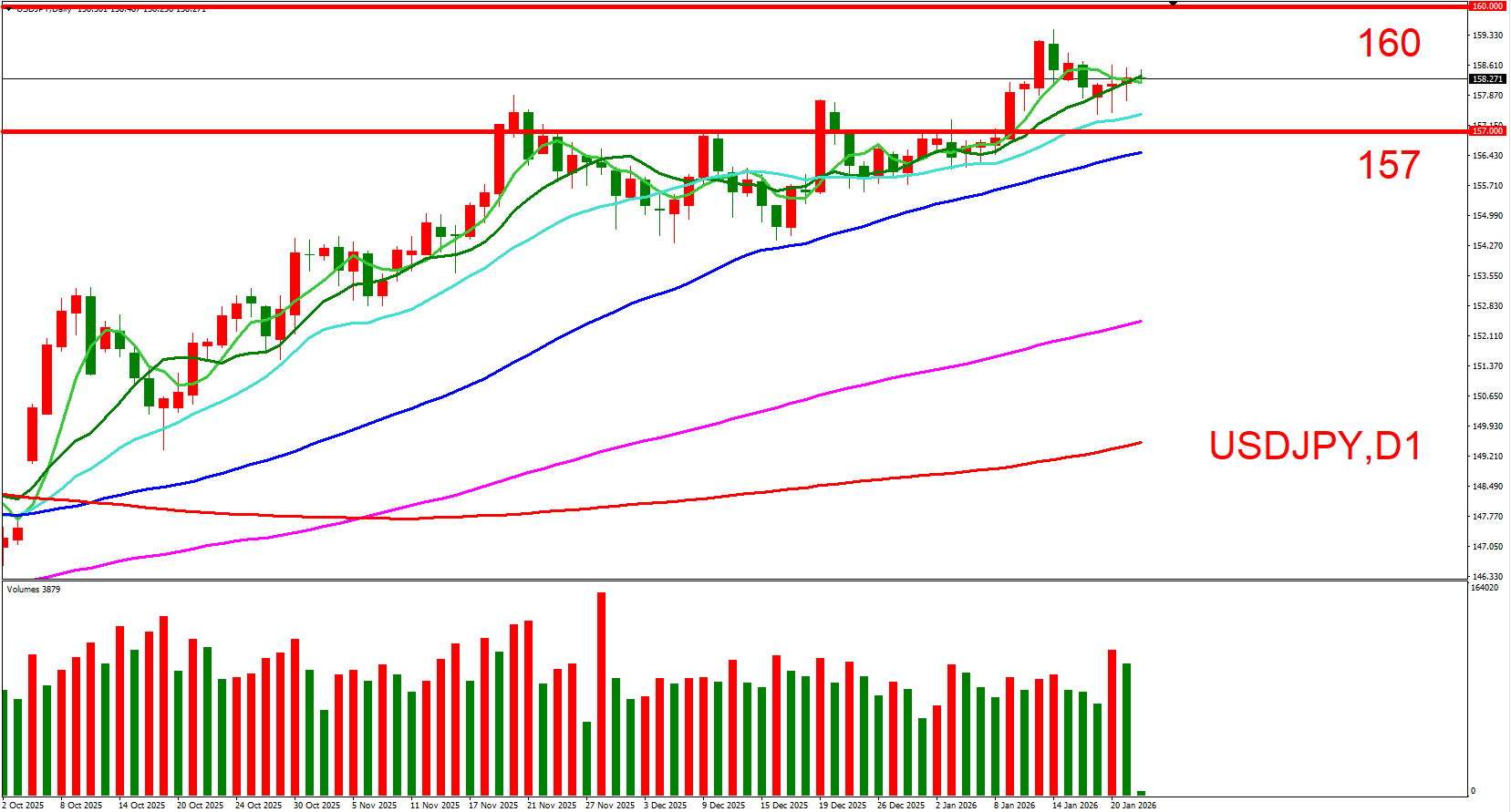 日本央行12月虽如预期降息,然而在记者会却意外大放鸽派论调,使得2026年大举升值希望再次落空,并且日本政局近期较为动荡,因此短线上美日兑将偏向多头看待。短线上可以(160,整数大关与日本央行心理防线)与(157,整数大关+短期均线支撑区)作为压力与支撑位来做参考。