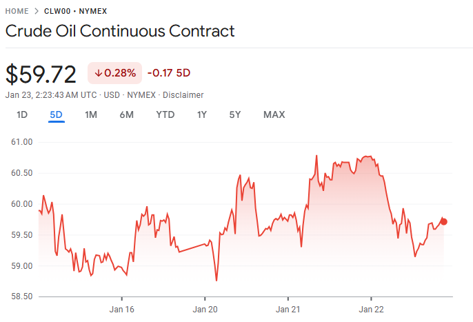 国际油价周四承压下行,因美国原油库存增加、俄乌和谈出现积极迹象,令市场对短期供应紧张的担忧暂时缓解。WTI 原油下跌 2.1%,收于每桶 59 美元附近,为两周来最低水平。