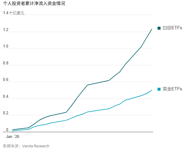 金价过去一年上涨了93%,银价上涨了265%。与此同时,交投最活跃的铂金合约本月上涨了28%,过去一年上涨了168%。推动这波买盘的因素包括,美元贬值、对美国****停摆的担忧、美国不断攀升的债务水平以及不断升温的地缘政治紧张局势。根据Vanda Research的数据,从去年12月中旬至今年1月中旬,个人投资者向白银ETF投入了9.218亿美元。研究人员称,这是有史以来规模最大的30天买入额。根据摩根大通(J.P. Morgan)的数据,去年个人投资者向主要黄金ETF投入的资金比过去五年的总和还要多。ETF目前持有1.006亿盎司黄金和8.35亿盎司白银,接近历史最高水平。