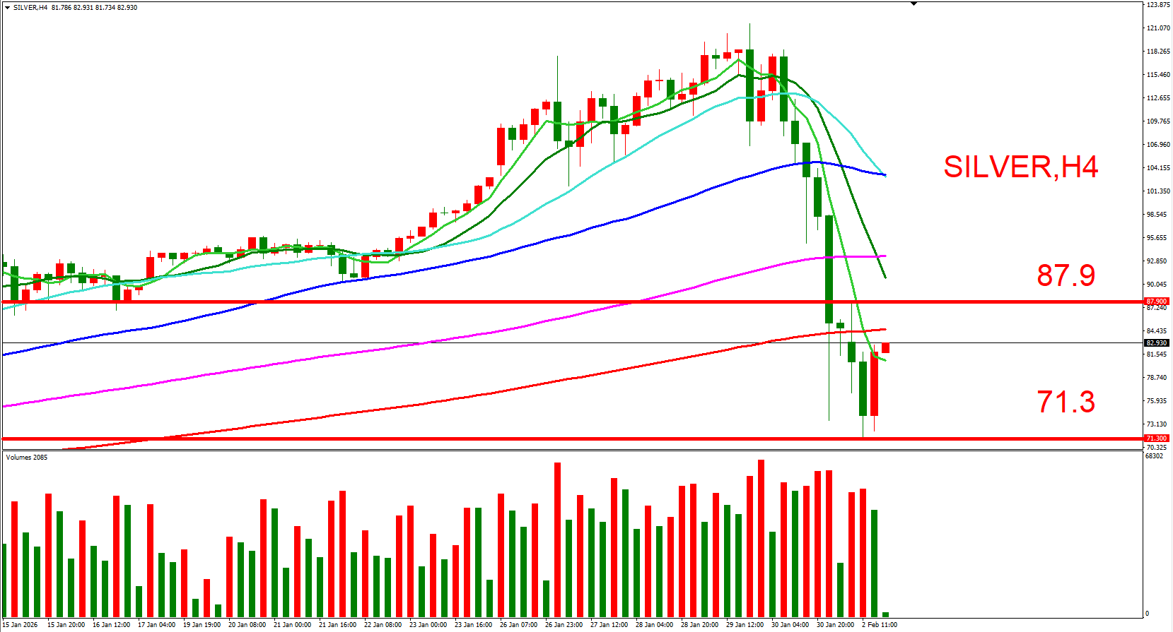 白银跟随黄金同步,短线偏空看待。可参考(87.9,今日反弹高位)与(71.3,今日为止长下影线低位),来作为压力与支撑位参考,用以判断低接或突破进场机会。