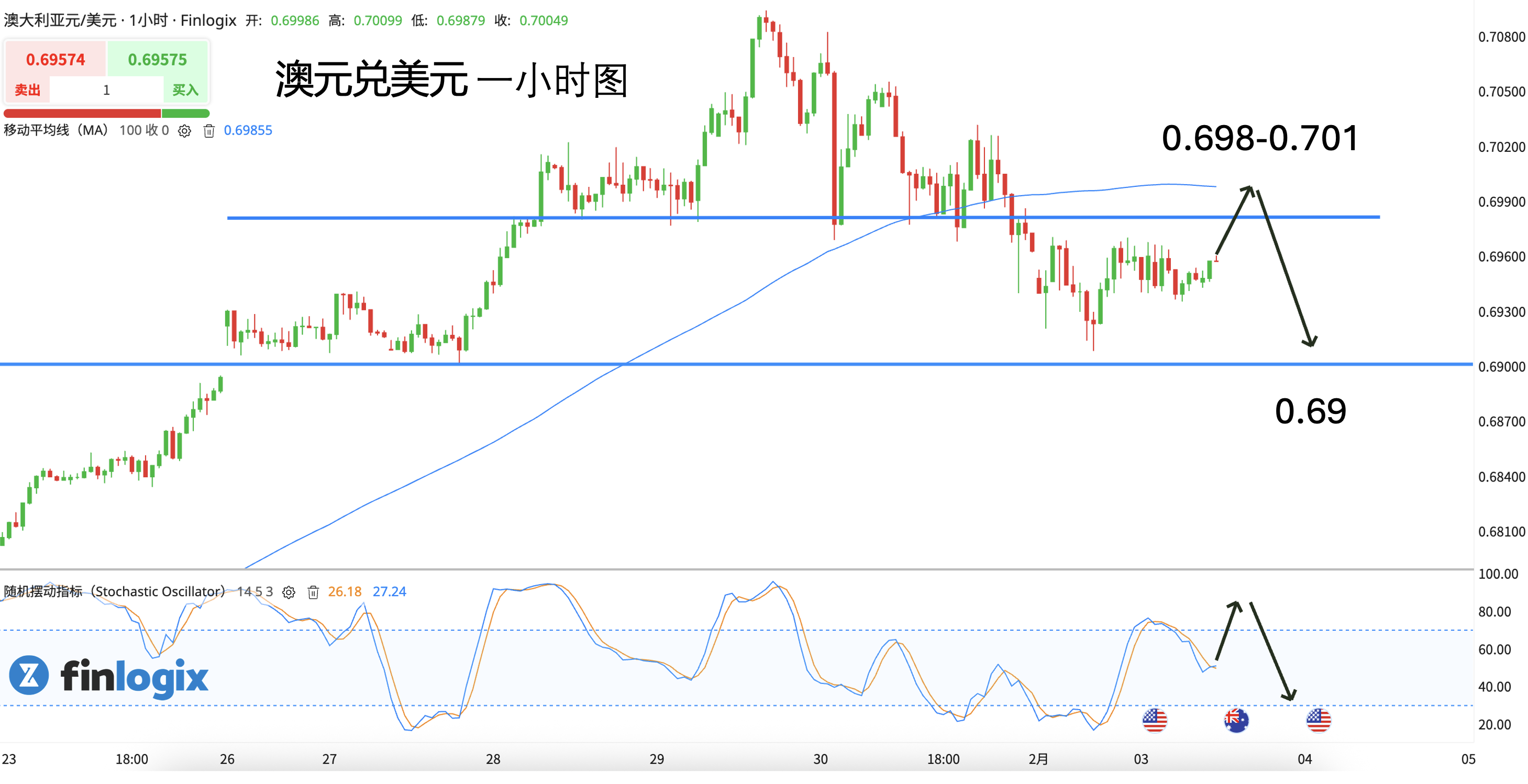 技术面:100均线转向水平,多头动能耗尽,且澳美已经跌破了关键的0.698颈线关口,不过在0.69前低点获得支撑。日内交易以回踩高位偏空为主。尤其关注大宗内盘金属价格的下跌动能,以及加息后的高位阻力。可以配合随机指标的超买区死叉,提高空单入场胜率。