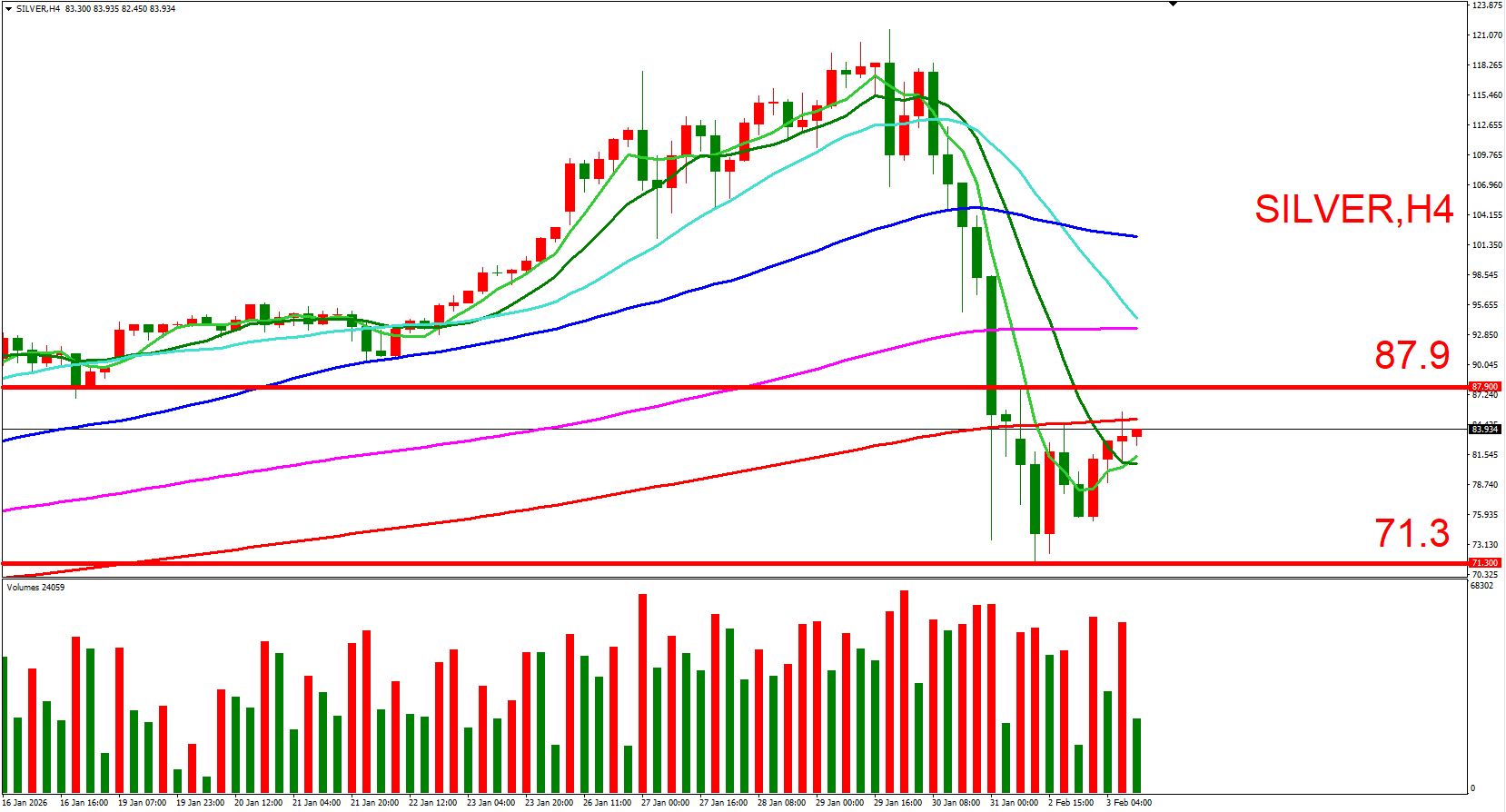 白银跟随黄金同步,短线偏空看待。可参考(87.9,2/2反弹高位)与(71.3,2/2长下影线低位),来作为压力与支撑位参考,用以判断低接或突破进场机会。