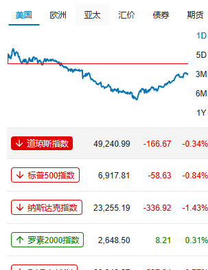 美股三大股指下跌,道指收跌0.34%,标普500指数跌0.84%,纳指跌1.43%。