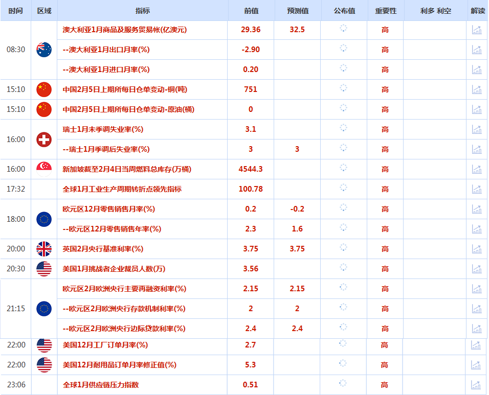 经济数据方面,当日公布的美国1月ADP民间就业岗位增长仅为22000个,远低于市场预期的48000个,这为美国劳动力市场可能放缓提供了早期信号。然而,更具权威性的美国1月非农就业报告因****停摆而推迟至2月11日发布,这一关键数据的缺席使市场处于观望状态,等待更明确的经济政策路径指引。