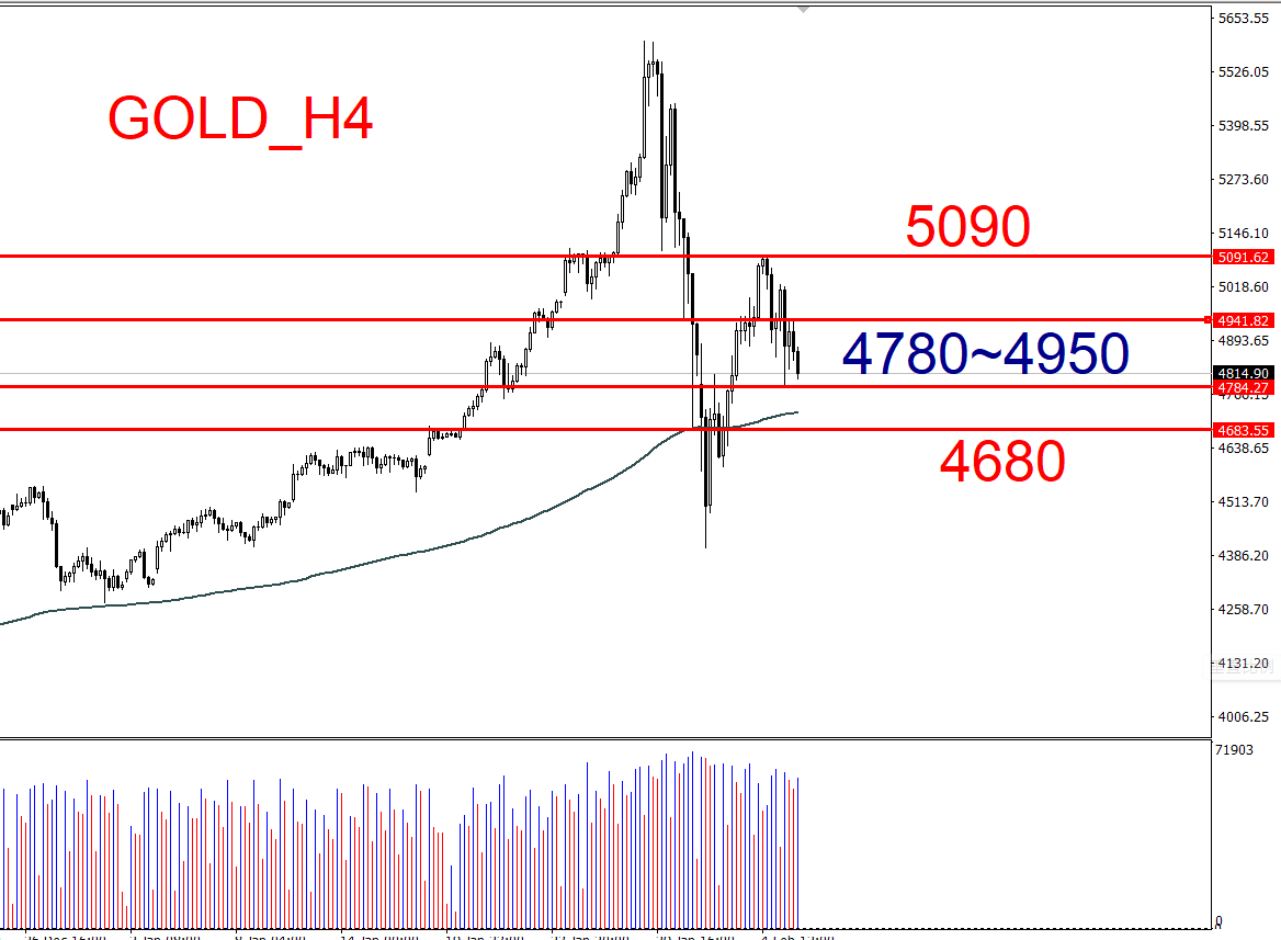 价格触及 4780并反弹可尝试多单,目标看向区间上沿(4950)。