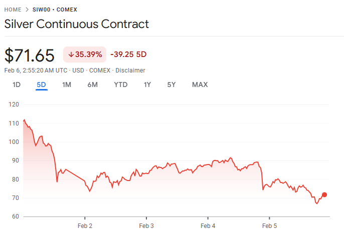 周四现货白银盘中一度暴跌 20%,跌破每盎司 71 美元关口;周五亚洲时段跌势延续。自上周触及历史高点以来,银价累计回落超过三分之一。历史波动率指标飙升,市场震荡程度创下 1980 年以来纪录。