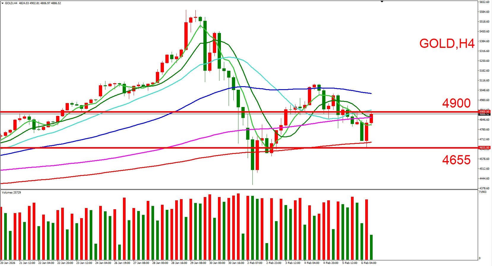 短线可以(4900,整数大关)与(4655,2/6下杀大量低位) 来作为压力与支撑位参考,用以判断低接或突破进场机会。