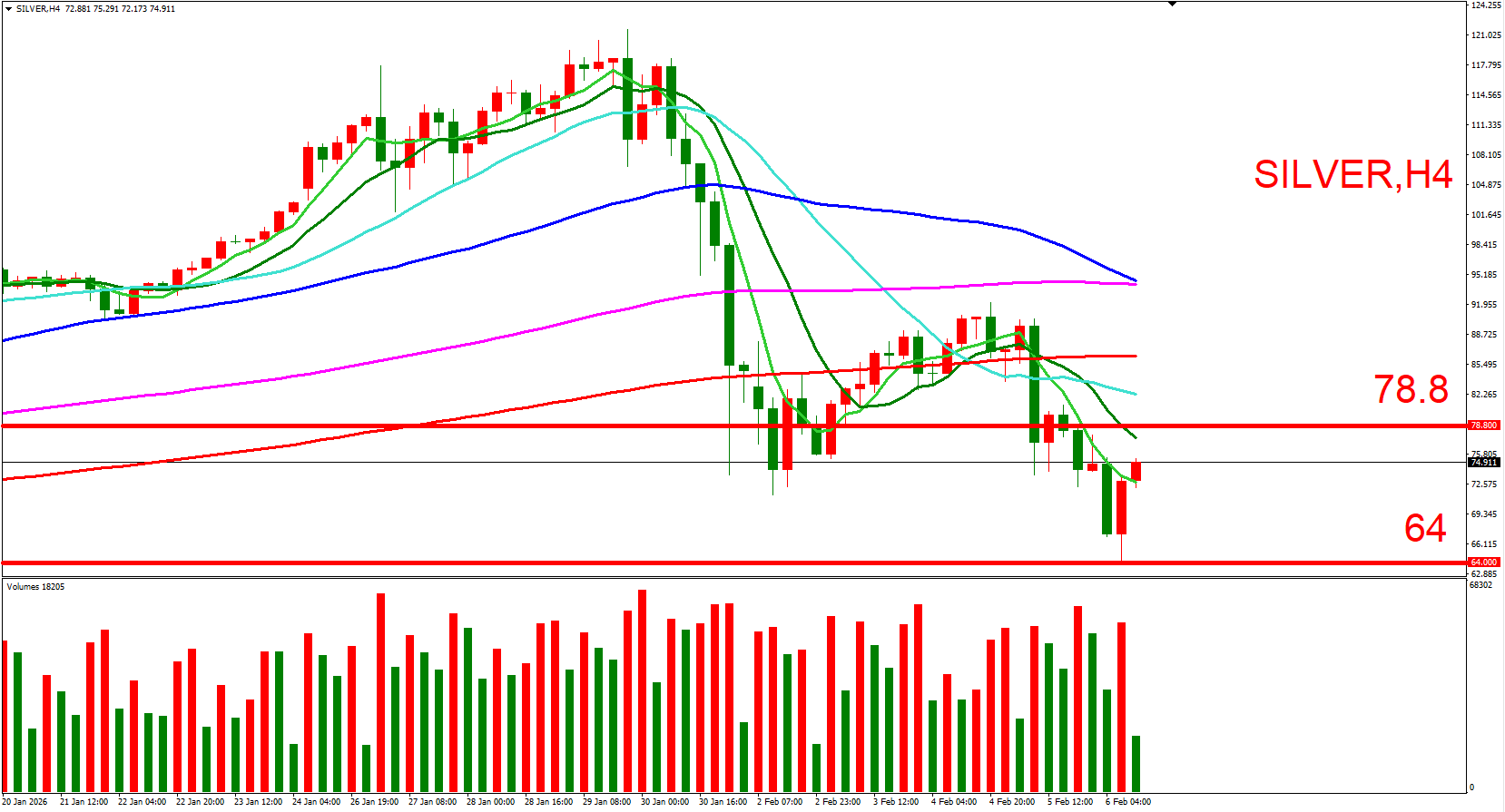 白银跟随黄金同步,短线反弹偏多看待。可参考(78.8,2/5大量低位)与(64,2/6下影线低位),来作为压力与支撑位参考,用以判断低接或突破进场机会。