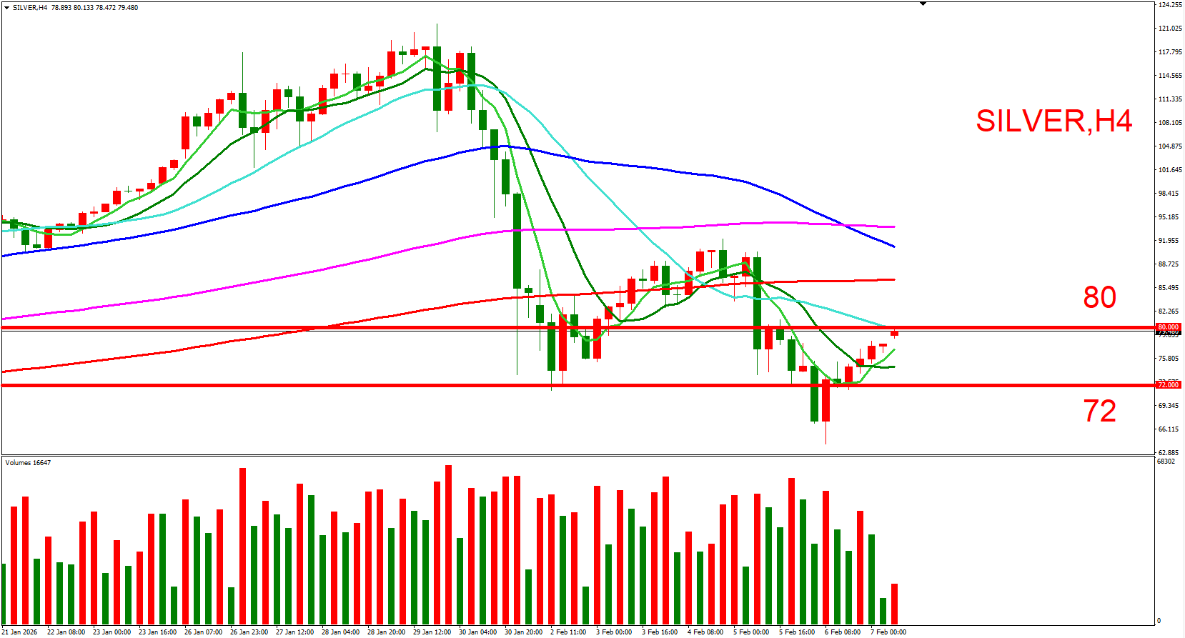白银跟随黄金同步,短线反弹偏空看待。可参考(80,整数大关)与(72,上周相对低位区),来作为压力与支撑位参考,用以判断低接或突破进场机会。