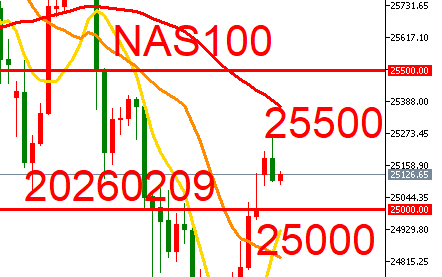 纳指现在重点关注250~25500并伺机往上送,道指已经上攻,现在看纳指和标普能否一并冲高。