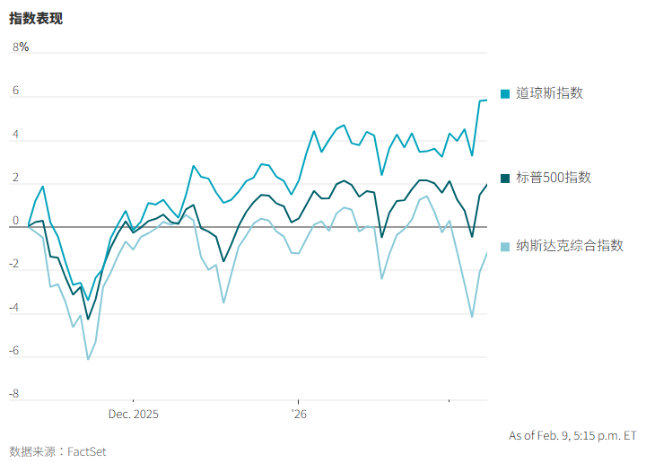 道琼斯指数上周五首次突破50,000点。在一个由科技股主导的市场中,一些出人意料的股票推动了此轮涨势。投资者目前为道指30家成份股支付的平均价格约为利润的22倍,高于2018年道指25,000点时的20倍。今年以来,科技股总体表现不佳。截至周一收盘,纳斯达克综合指数年内基本持平,道琼斯指数则上涨4.3%。更能说明问题的是,标普500等权重指数上涨近6%,而传统的按市值加权的标普500指数涨幅为1.7%。标普500等权重指数在很大程度上消除了八家科技巨头超大的影响力,这八家巨头的合计市值占到标普500指数成分股公司总市值的三分之一以上。