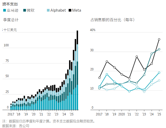 微软(Microsoft)、Meta Platforms、亚马逊(Amazon)和Alphabet旗下谷歌(Google)这四家美国科技巨头正争相提高运营和扩展各自AI相关业务所需的计算能力,计划仅在今年就投入高达6,700亿美元建设AI基础设施。这已成为一个日益昂贵的项目,这些公司用它们数以十亿美元计的广告、云和订阅收入来为此提供资金。过去几年,这些公司的资本支出占其年度收入的百分比一直在增加。根据分析师的预测,到2026年,Meta的支出可能首次相当于其销售额的50%以上。然而,亚马逊的投资者对该公司今年将资本支出大幅增加近60%至2,000亿美元的计划并不买账,亚马逊市值上周五蒸发了1,240亿美元。